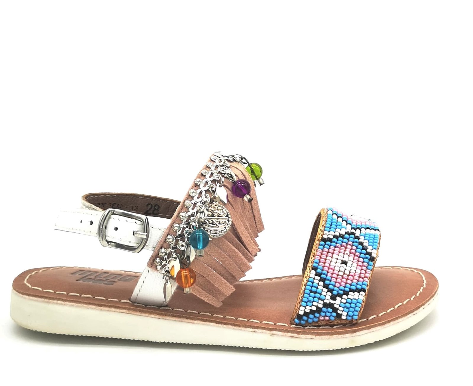 Παιδικά κοριτσίστικα boho πέδιλα, σε λευκό χρώμα με σομόν κρόσσια & πολύχρωμες χάντρες.