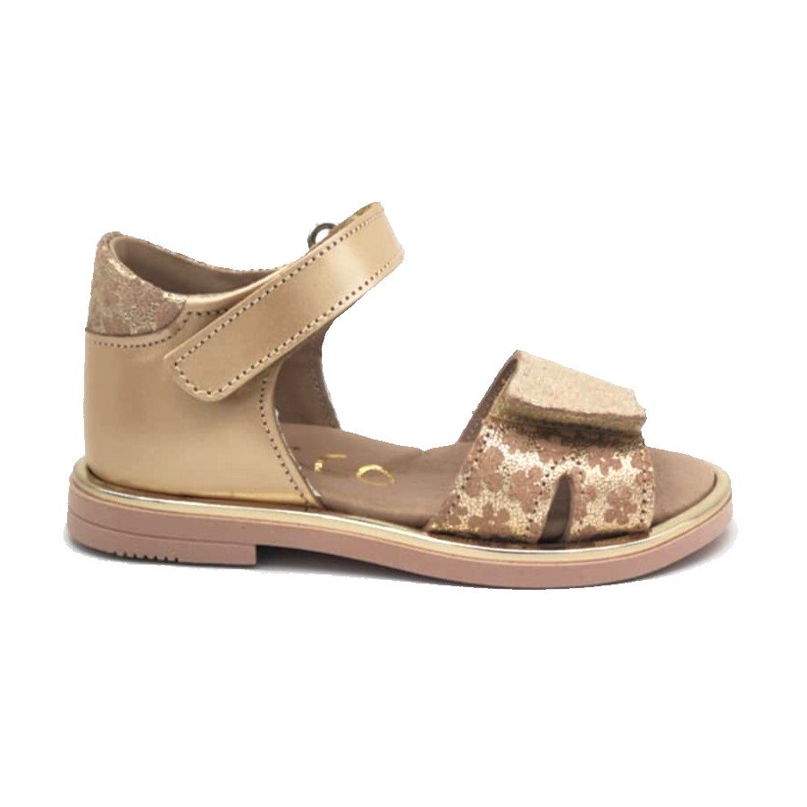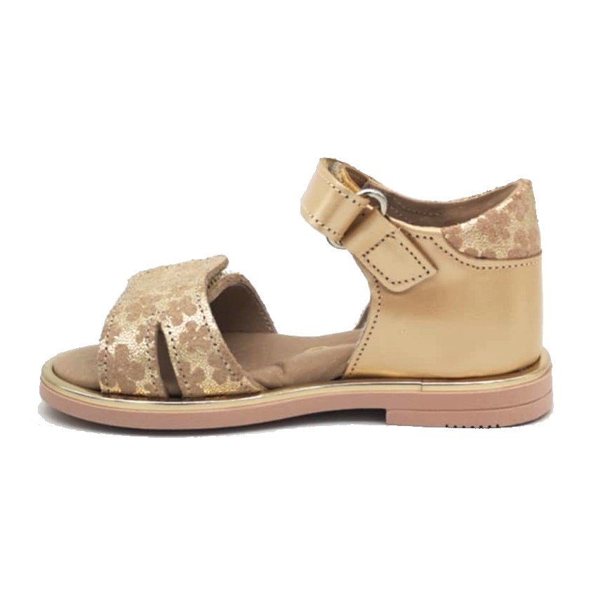 Παιδικά bebe δερμάτινα πέδιλα, με κλειστή φτέρνα & ανοιχτή μύτη, σε χρώμα χρυσό, με σταμπωτό σχέδιο λουλούδια.