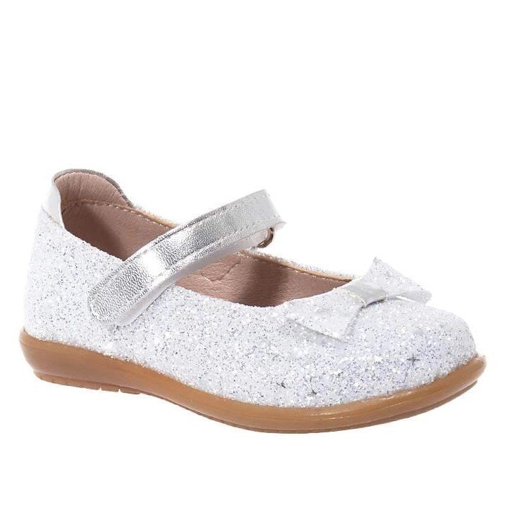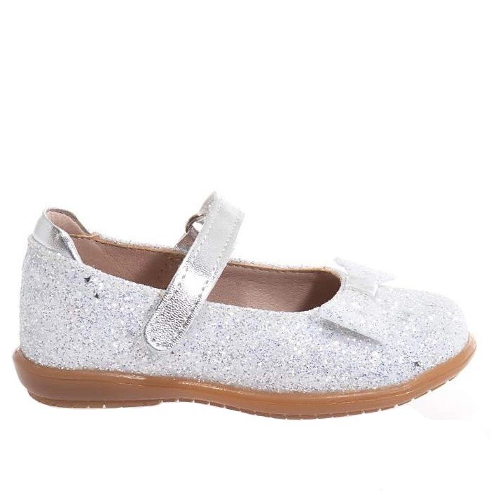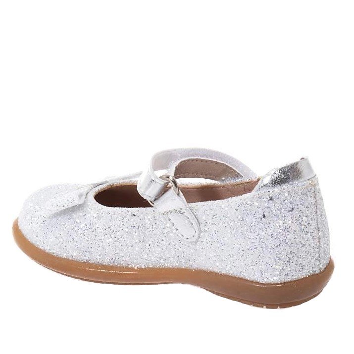 Παιδικές bebe δερμάτινες μπαρέτες σε λευκό glitter χρώμα με φιογκάκι & ασημί λουράκι.